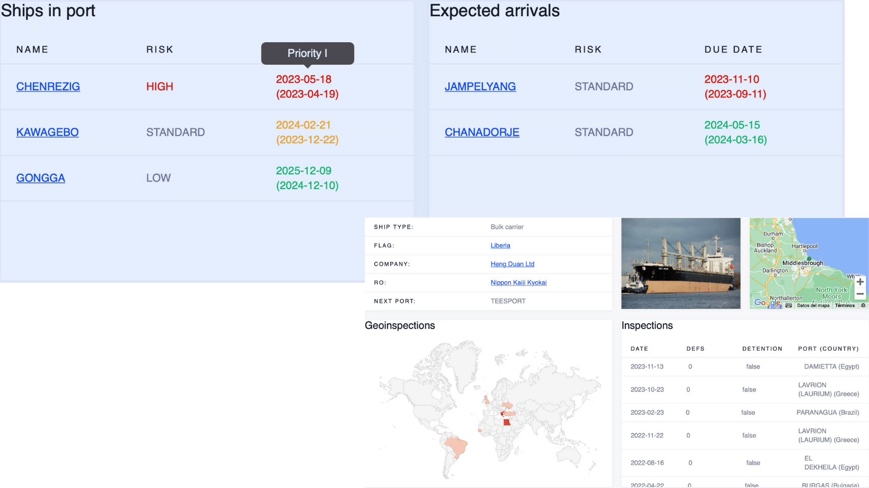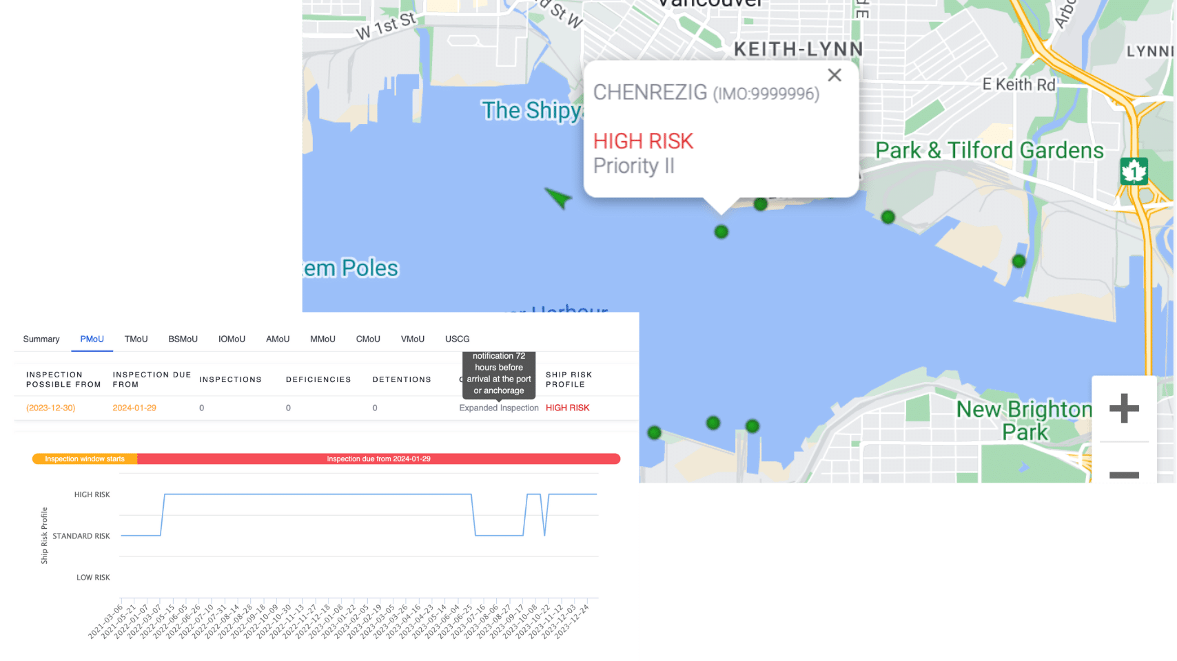 Understand the associated PSC risk of each ship calling at your port and identify whether inspections are due. Review previous deficiencies and detentions, company performance, flag, and classification status. Access all relevant risk indicators in one place to support effective vessel screening.